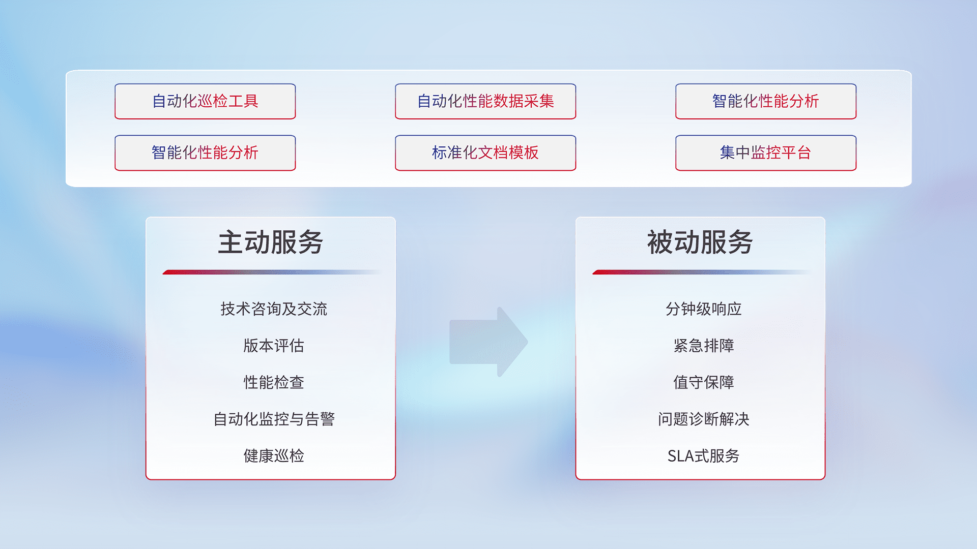 智能化工具和标准化文档,,,保障服务质量,,提供主动服务(包含技术咨询、、版本评估、、、性能检查、、、自动化监控与告警、、、健康巡检)和被动服务包含(分钟级响应、、、、紧急排障、、、值守保障、、问题诊断解决、、、SLA服务)。。。。